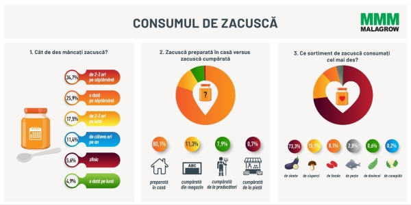 40 la sută din populație consumă zacuscă de mai multe ori pe săptămână, iar unul din patru români mănâncă o dată pe săptămână din această specialitate românească, potrivit celui mai recent sondaj pe un eșantion mare realizat de Malagrow România, acoperind întreaga țară. Marea majoritate preferă zacusca făcută acasă, pe care, de obicei, o prepară ei înșiși. Cele mai mari cantități de zacuscă sunt produse în județele Ilfov, Iași și Mureș. Preferata este, în mod clar, zacusca de vinete.